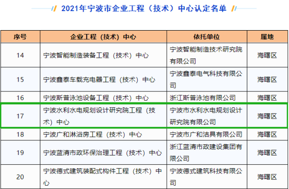發(fā)布日期:2022.09.15 近日,寧波市發(fā)展和改革委員會、寧波市經(jīng)濟(jì)和信息化局、寧波市財政局、寧波市科學(xué)技術(shù)局聯(lián)合發(fā)文,公布2021年寧波市企業(yè)工程(技術(shù))中心認(rèn)定名單。我院為主體申報的“寧波水利水電... -