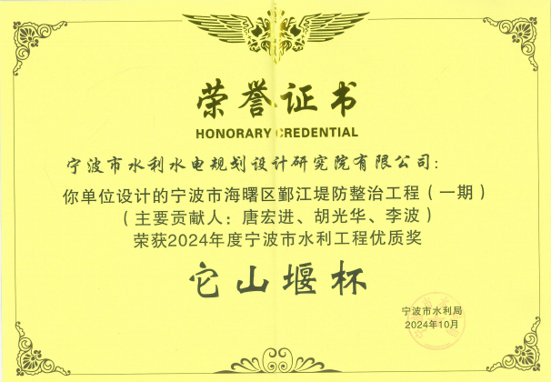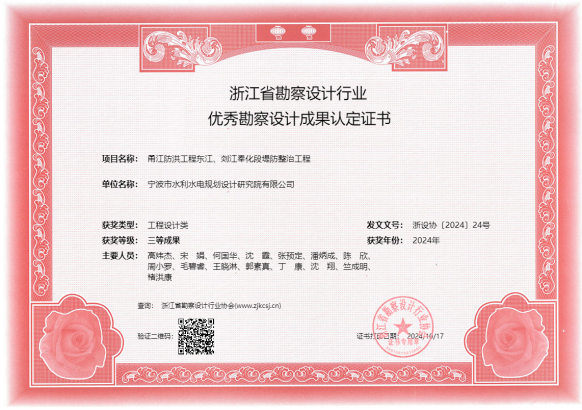 在工程項目方面,獲得2022年度全國優(yōu)秀工程咨詢成果獎、2024年度寧波市優(yōu)秀勘察設(shè)計獎、2024年浙江省勘察設(shè)計行業(yè)優(yōu)秀勘察設(shè)計”綜合類成果獎、寧波市優(yōu)秀水利工程設(shè)計二等獎、“浙江省文明標化工地”稱號、“2024年度寧波軌道交通市域鐵路工程立功競賽先進集體”等各類獎項十余項。
