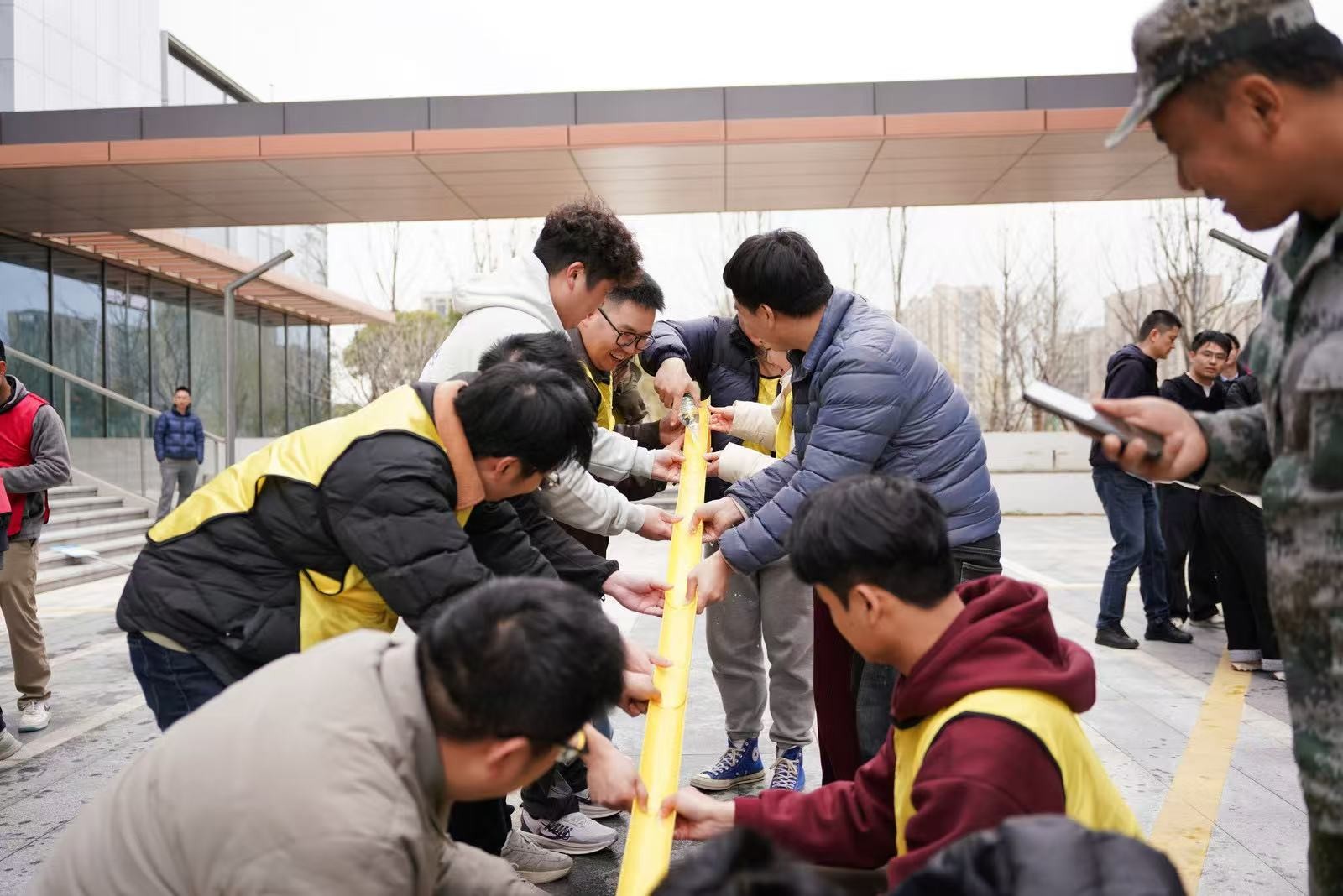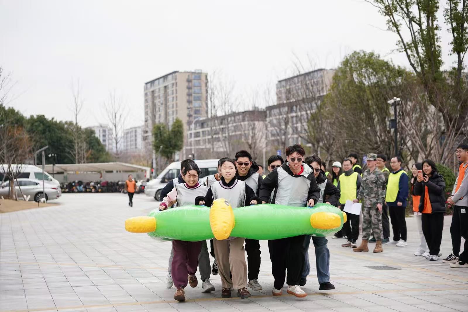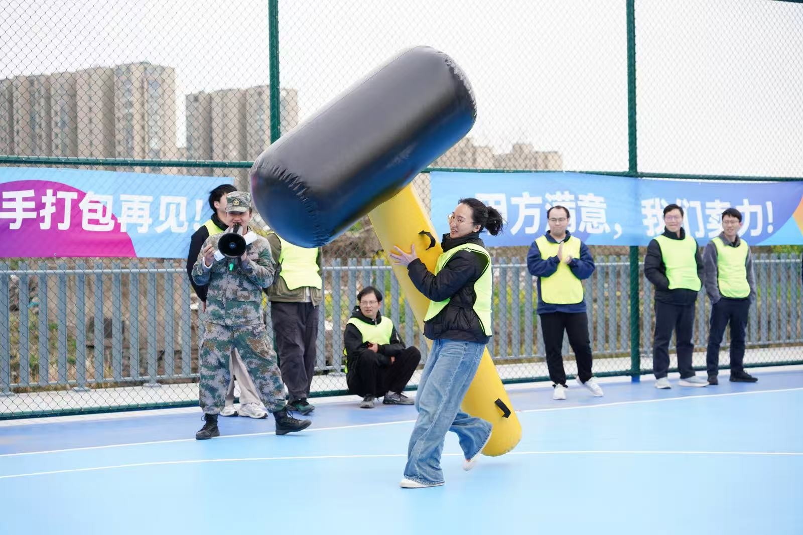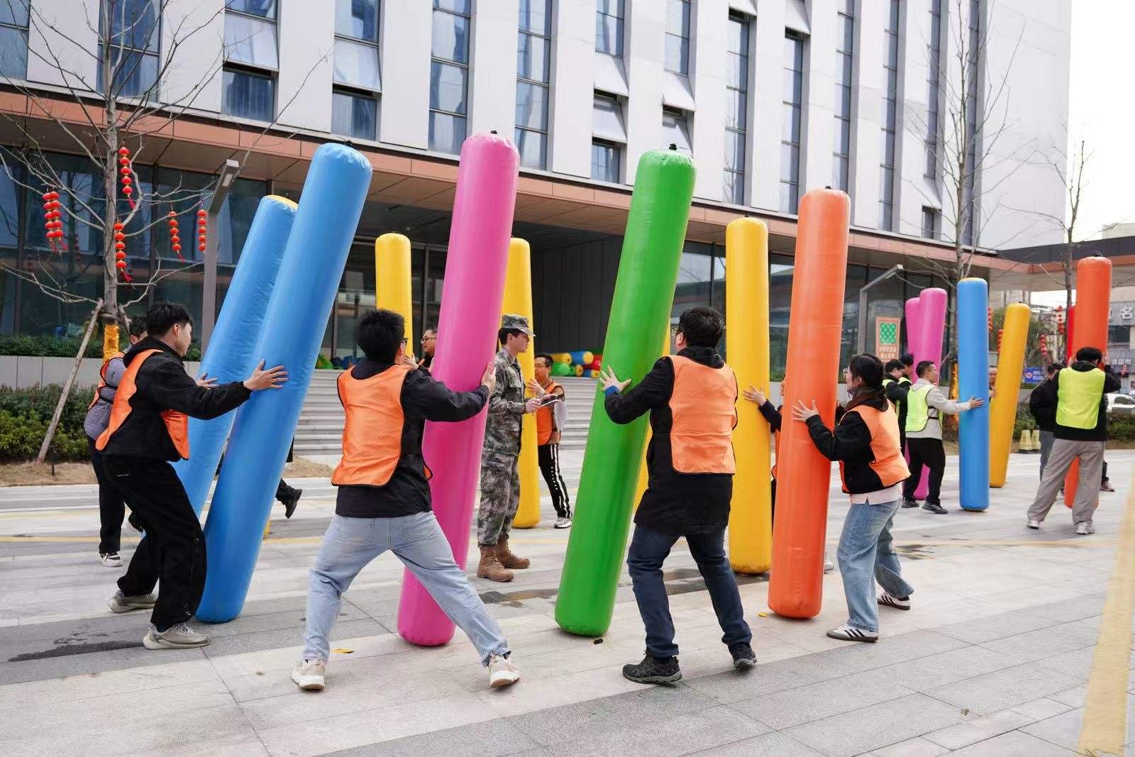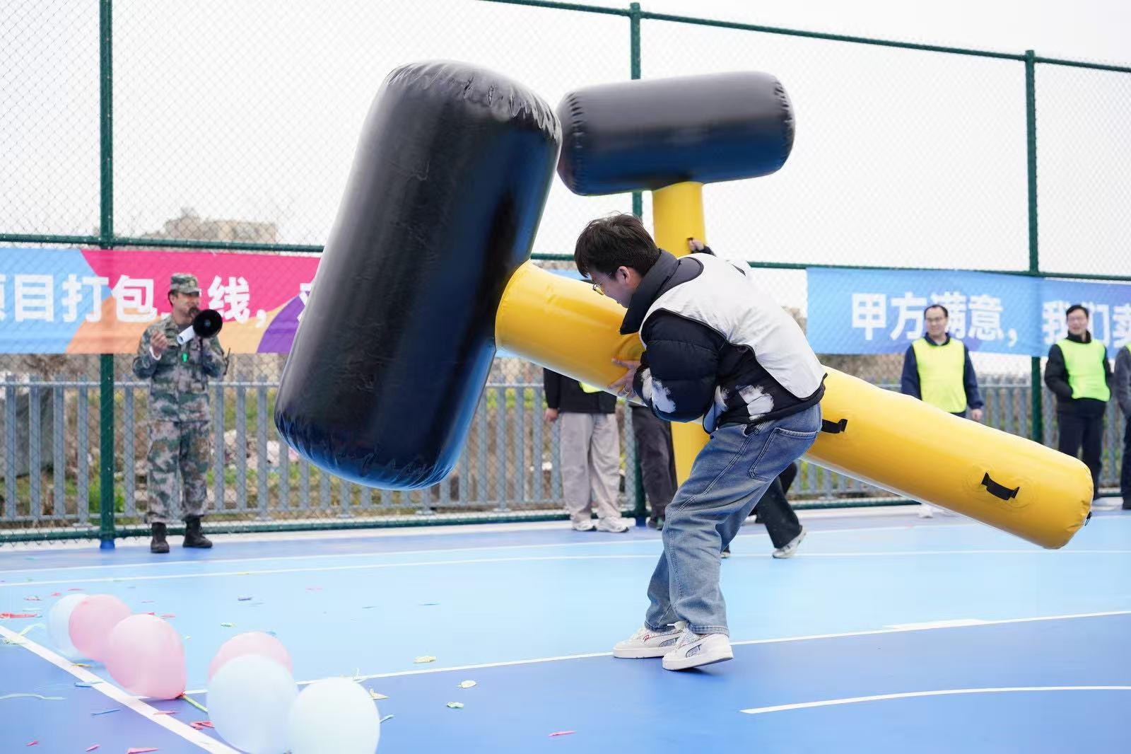 在“南水北調”項目中,隊員們手持PVC管接力運水,5分鐘內爭分奪秒,讓水流在管中傳遞涌向重點,仿佛將團隊的信任與責任匯聚成河。“龜兔賽跑”則讓隊員們化身可愛的“烏龜”和“兔子”,在賽道上你追我趕,妙趣橫生。“鴻運亨通”需要8人共同托舉大球折返跑,大家步調一致,齊頭并進。“一錘定音”環(huán)節(jié),隊員們揮動充氣大錘敲破氣球,每一聲“砰”響都引來陣陣喝彩。