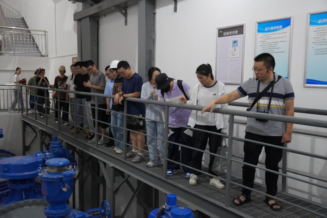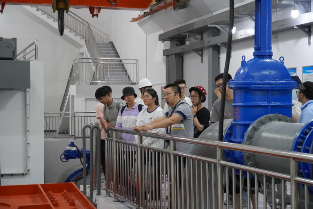 最后,研學(xué)隊(duì)伍來(lái)到北堤樞紐參觀。該工程榮獲中國(guó)建筑行業(yè)工程質(zhì)量的最高榮譽(yù)獎(jiǎng)——2020-2021年度第一批中國(guó)建設(shè)工程魯班獎(jiǎng)。胡經(jīng)理帶領(lǐng)研學(xué)隊(duì)伍依次進(jìn)入啟閉機(jī)房、觀景臺(tái)、控制室等處,現(xiàn)場(chǎng)講解工程設(shè)計(jì)思路、建造工藝和管理要點(diǎn)。