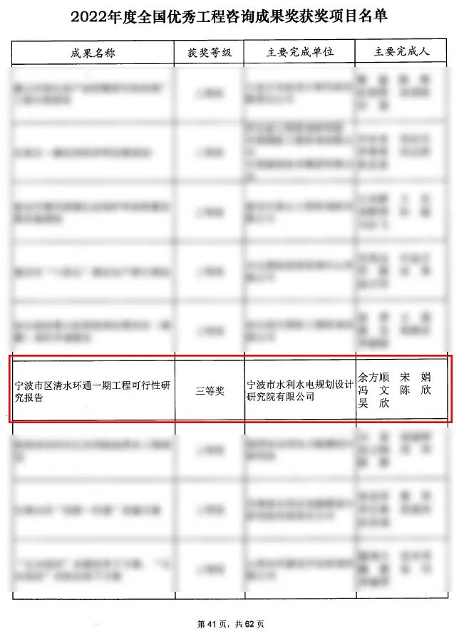 近日,中國工程咨詢協(xié)會(huì)公布2022年度全國優(yōu)秀工程咨詢成果獎(jiǎng)獲獎(jiǎng)項(xiàng)目名單,寧波市水利院申報(bào)的《寧波市區(qū)清水環(huán)通一期工程可行性研究報(bào)告》咨詢成果順利通過公示,榮獲2022年度全國優(yōu)秀工程咨詢成果三等獎(jiǎng)!該獎(jiǎng)項(xiàng)由中國咨詢工程協(xié)會(huì)組織申報(bào)評(píng)審,每?jī)赡暝u(píng)選一次,是中國工程咨詢行業(yè)含金量最高的獎(jiǎng)項(xiàng)。
