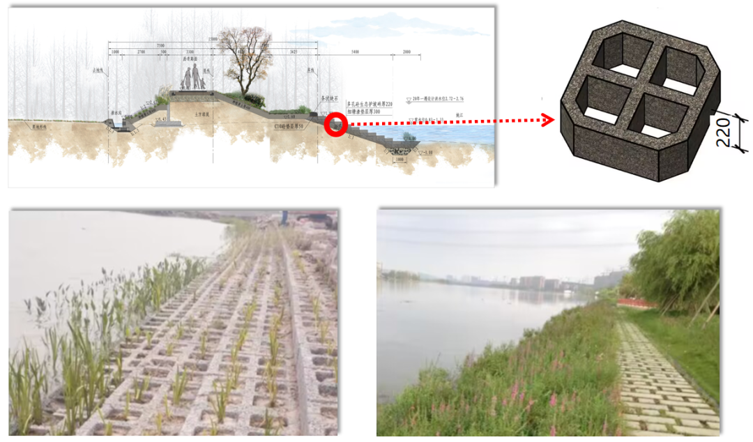 為了保證水體交換同時(shí)防御土體掏刷,工程迎水側(cè)護(hù)坡采用多孔混凝土生態(tài)護(hù)坡磚,不僅防沖固土,也利于水生動(dòng)植物生長,營造自然、生態(tài)的水岸環(huán)境。