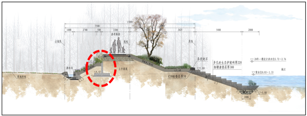 將沿線工業(yè)設(shè)施保護(hù)和農(nóng)村社區(qū)民生福祉提升納入核心考量范疇,沿線綜合融入休閑、健身、文化展示等功能,將堤防打造成城市公共空間或?yàn)I水景觀帶。