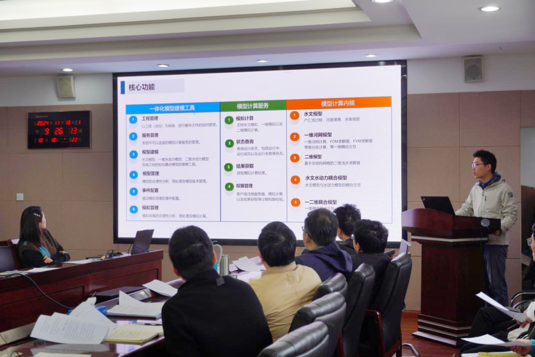 隨后,平臺研發(fā)團隊代表陳龍贊對“澤圖水文水動力一體化模型平臺”進行詳細(xì)介紹,并進行現(xiàn)場實操演示。該平臺是一套我院自主研發(fā)的以組件化建模、并行化求解、在線化計算、一體化耦合、國產(chǎn)化支持為核心的水文水動力模型平臺,能夠滿足包括產(chǎn)匯流計算、水庫調(diào)度、一維河網(wǎng)、二維淹沒、水文水動力耦合、一二維水動力耦合在內(nèi)的多種模擬需求,適用于獨立部署、嵌入第三方項目等多種應(yīng)用場景?;诮9ぞ摺⒛P头?wù)、計算核心三分離的設(shè)計架構(gòu),平臺具備分布式部署、集群化管理、多節(jié)點負(fù)載均衡的動態(tài)能力,滿足靈活適用多種尺度的計算需要。